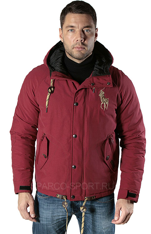 Материал верха куртки: хлопок 60% и нейлон 40%. Подкладка выполнена из полиэстера. Утеплитель: тонкий слой синтепона. Оригинальная золотистая эмблема слева чуть выше груди украшает изделие. На капюшоне и на нижней части куртки есть утягивающий шнур- застежка золотистого цвета. Есть цвета: бордо, синий.