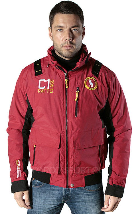 Мужская куртка из смеси хлопка и нейлона имеет полиэстеровую подкладку, наполнитель - тонкий синтепон. Варианты цветов данной модели - синий и красный, с оригинальной отделкой черного цвета на рукавах, поясе и плечах. На куртке две ярких эмблемы. Молния открытая, застежка декорирована желтой тесьмой.