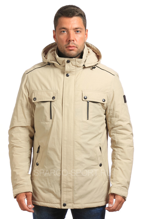 Модная мужская куртка, представленная в благородных цветах бежевый и хаки. Верхняя часть изделия пошита из ноской ткани, состоящей из нейлона с хлопком. Подкладка - полиэстер, утеплитель - синтепон. Особый шик модели придают декоративные погоны и хлястик с кнопками, выполненные в цвете основного изделия. Куртка застегивается на две молнии, одна из которых находится на внутренней части изделия, и металлические кнопки. Имеется капюшон и четыре вместительных кармана: два оснащенных клапанами на груди и два боковых, закрывающихся на молнию.