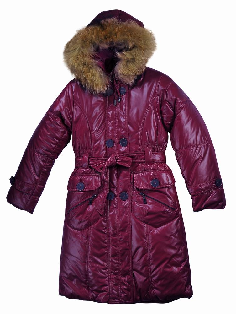 Описание: Пальто зимнее средней длины с отделкой натуральным мехом на капюшоне - енот. В качестве утеплителя в пальто использован холофайбер. Приталенного силуэта, с поясом по талии, верхняя ткань имеет эффект "лакового" блеска.