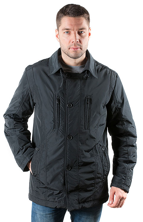 Куртка удлиненная, утеплена тонким синтепоном, верхняя ткань из нейлона. Прямой силуэт , классический отложной воротник, наружная застежка – вертикальный ряд пуговиц с фирменным логотипом на имитированной широкой планке. Спереди, с лицевой стороны, имеются два симметричных нагрудных кармана на молнии и два стандартных боковых кармана.