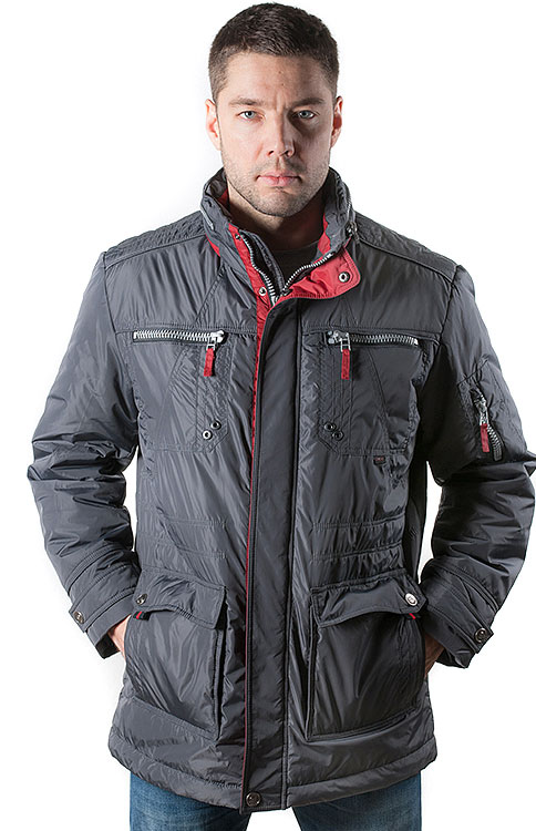 Куртка мужская 12150 серого цвета с декоративными элементами красного цвета, утепленная синтепоном. Куртка имеет застежку в виде молнии и кнопок. Воротник-стойка, 4 кармана (потайные на груди и накладные по бокам), дополнительный карман на молнии на левом рукаве. Капюшон на воротнике спрятан под молнию.