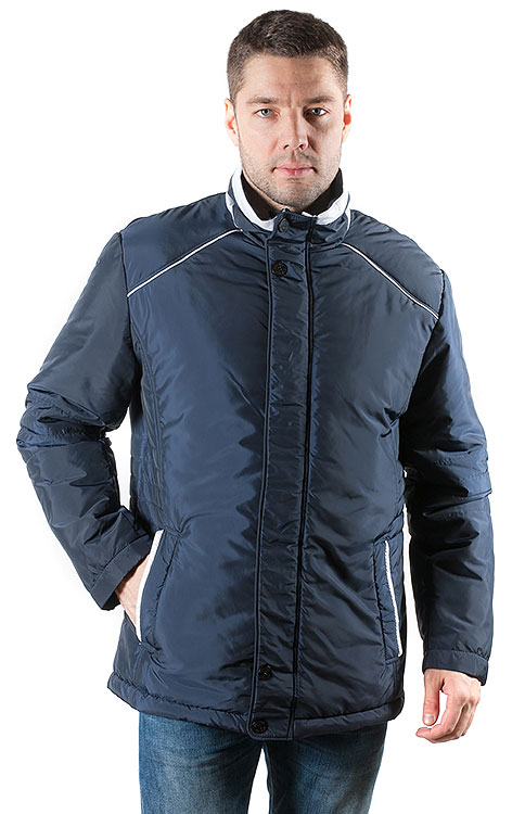 Куртка мужская без капюшона с воротником-стойкой. Изготовлена из полиэстера, внутри утеплитель из тонкого синтепона. Модель представлена в благородном синем цвете с белыми полосками, которые обрамляют боковые прорезные карманы, воротник-стойку и плечевую зону. Данный фасон отлично скроет недостатки фигуры: выделит плечи, уберет живот.