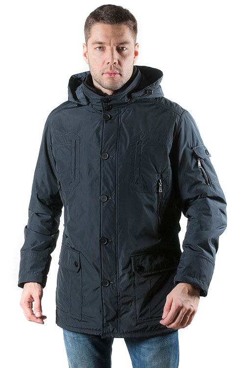 Куртка выполнена в двух цветах . Удлиненная прямая модель с отстегивающимся капюшоном, трикотажной стойкой и двойной застежкой: с потайной молнией и наружной на пуговицах. Основные накладные карманы с клапанами дополняют нагрудные, на рукаве и внутренний. Сзади по линии талии – декоративная горизонтальная планка.