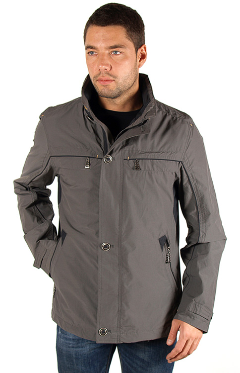 Удлиненная ветровка, прямого силуэта, из смесовой ткани: хлопка с добавлением нейлона, без утеплителя, с подкладкой из полиэстера. Модель представлена в двух вариантах: черно-сером и серо-черном оттенках. Воротник-стойка, двойная застежка – потайная (на молнии), скрытая планкой на пуговицах. Снаружи четыре кармана на молнии: два по бокам и два нагрудных.