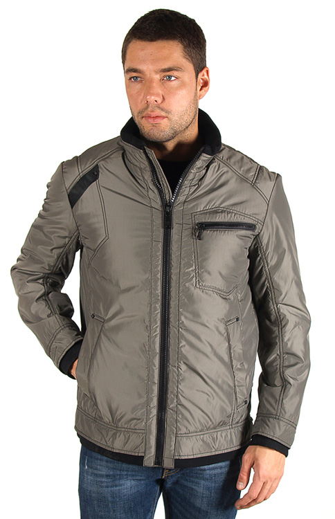 Куртка из полиэстера — прямой силуэт и строгие линии. Серый и зеленый цвета, отливающие металлом. Низ куртки, манжеты и воротник оторочены изнутри теплым материалом. Центральная застежка и передний карман закрываются на молнию черного цвета. Вставка черного цвета около плеча. Прострочена интересным отделочным швом.
