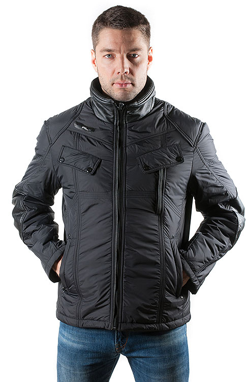 Куртка черная, из нейлона, с тонким синтепоном. Прямой силуэт модели с застежкой на молнии, воротником-стойкой и карманами: основными по бокам и нагрудными с клапанами на кнопках. Декоративным оформлением выступают глянцевые детали налокотников и внешней стороны ворота, а также отстроченные на спине геометрические фигуры.