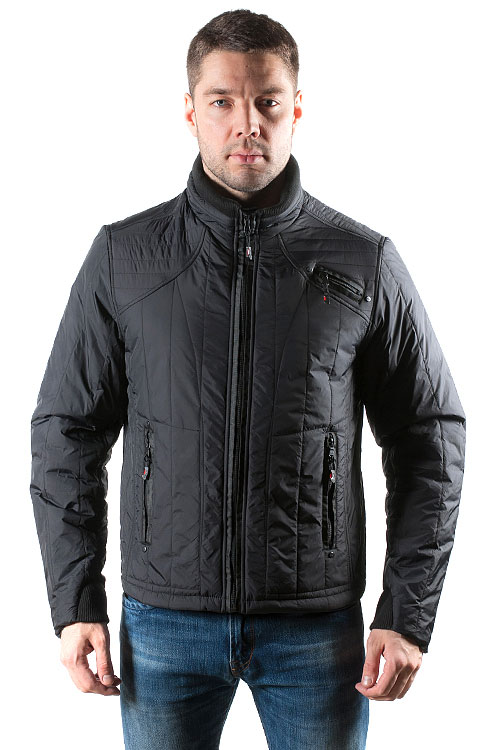 Куртка прямого кроя, короткая, черного цвета. Верхний слой из нейлона, утеплена тонким синтепоном. Застежка на молнии; воротник-стойка по краю обшит мягкой трикотажной резинкой. Модель с тремя карманами на молнии: два внизу по бокам и один – декоративный, возле левого плеча. Демисезонная куртка простегана вертикальными строчками.