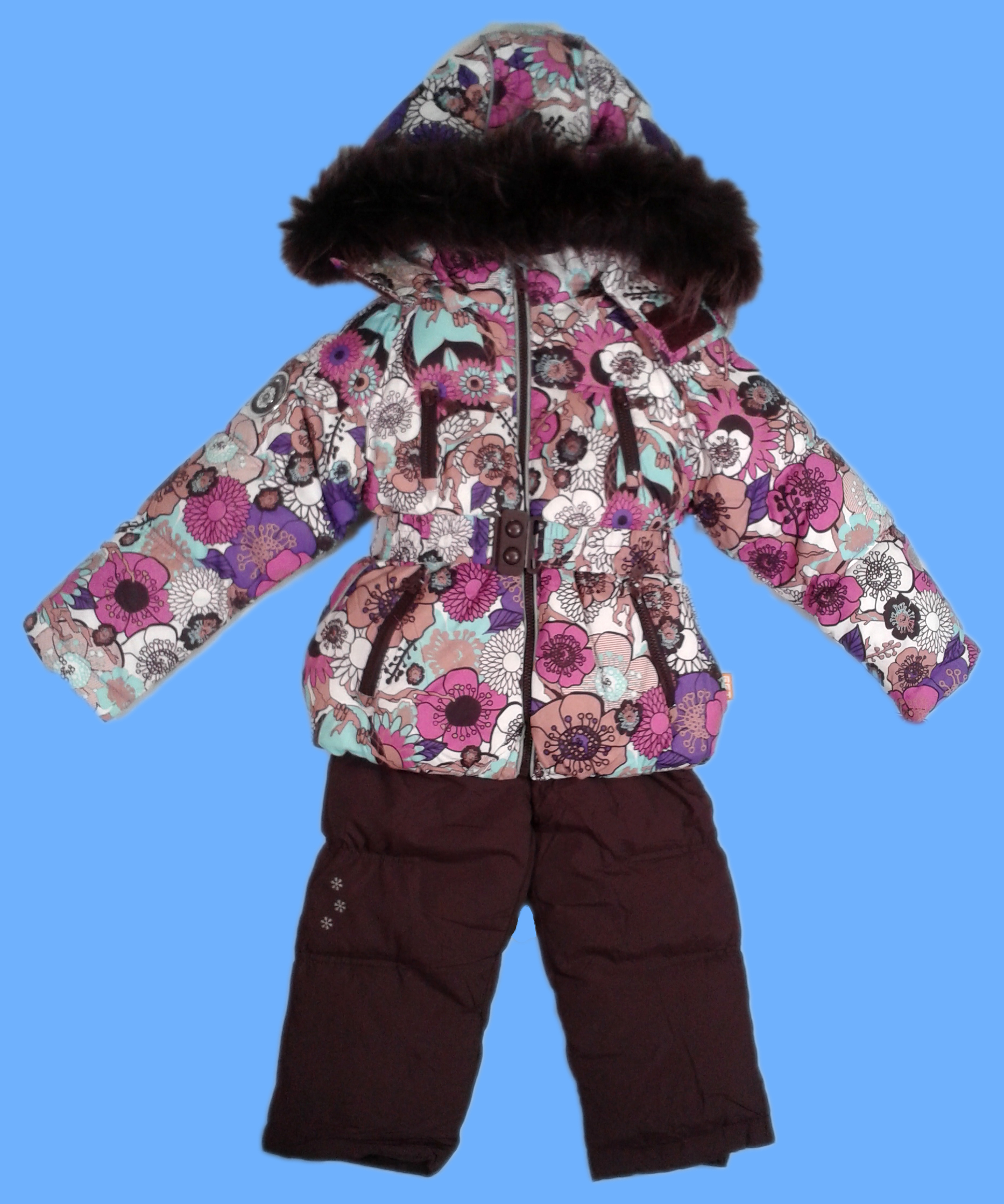 Описание: Комплект состоит из куртки на холофайбере с отделкой на капюшоне натуральным мехом - лиса и полукомбинезона с грудкой с регулирующими бретельками и внутренней резинкой по низу брюк.