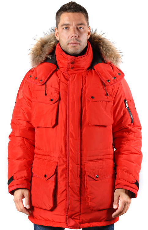 Пуховик мужской R-FL2, выполненный с обеих сторон из 100% полиэстера. В ассортименте имеются две расцветки: ярко красная и черная. В качестве утеплителя использовано 80% пуха и 20% пера. Капюшон украшен отделкой из натурального меха енота. Застежка скрыта под планкой. Имеется четыре накладных кармана на груди и по бокам, а также кармашек на молнии на левом рукаве.